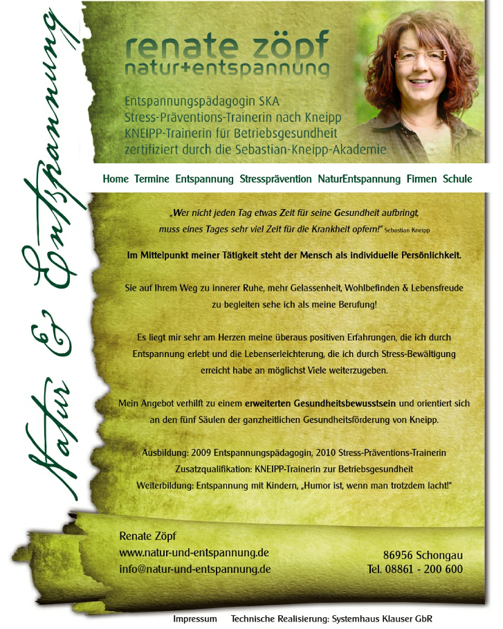 Home termine entspannung stresspraevention naturentspannung firmen schule E-Mail: info@natur-und-entspannung.de impressum Technische Realisierung: fiedler-IT