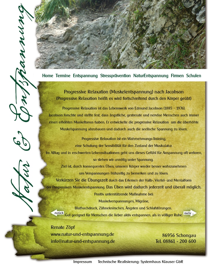 Home termine entspannung stresspraevention naturentspannung firmen schule E-Mail: info@natur-und-entspannung.de impressum Entspannungsmethoden_01 Entspannungsmethoden_03 Technische Realisierung: fiedler-IT