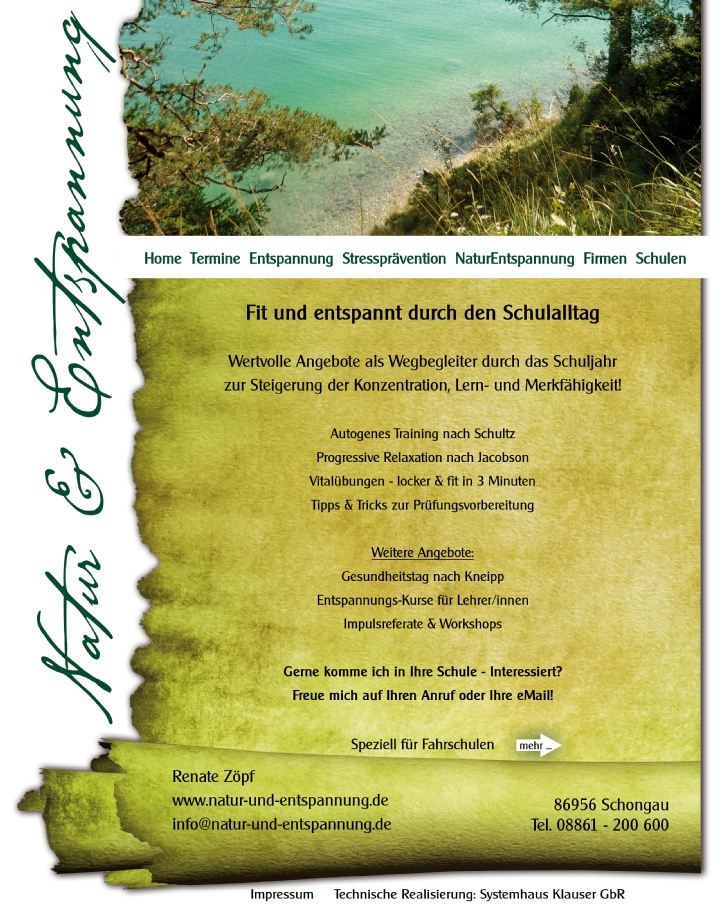 Home termine entspannung stresspraevention naturentspannung firmen schule E-Mail: info@natur-und-entspannung.de impressum fahrschulen E-Mail: info@natur-und-entspannung.de Technische Realisierung: fiedler-IT